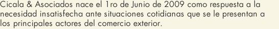 Estudio CICALA & ASOCIADOS nace el 1ro de Junio de 2009 como respuesta a la necesidad insatisfecha ante situaciones cotidianas que se le presentan a los principales actores del comercio exterior, desde armadores, operadores, charteadores hasta exportadores, importadores, estibadores.